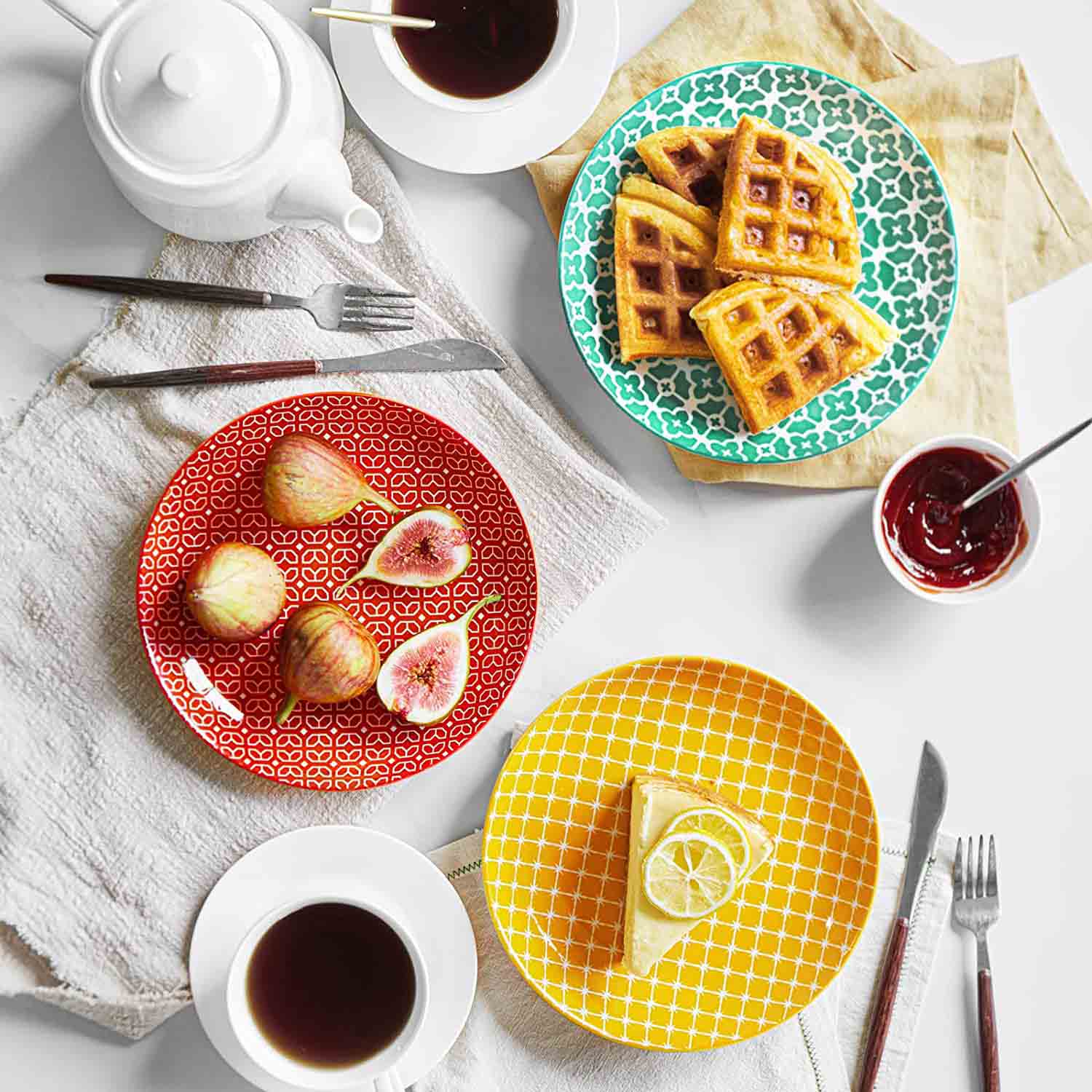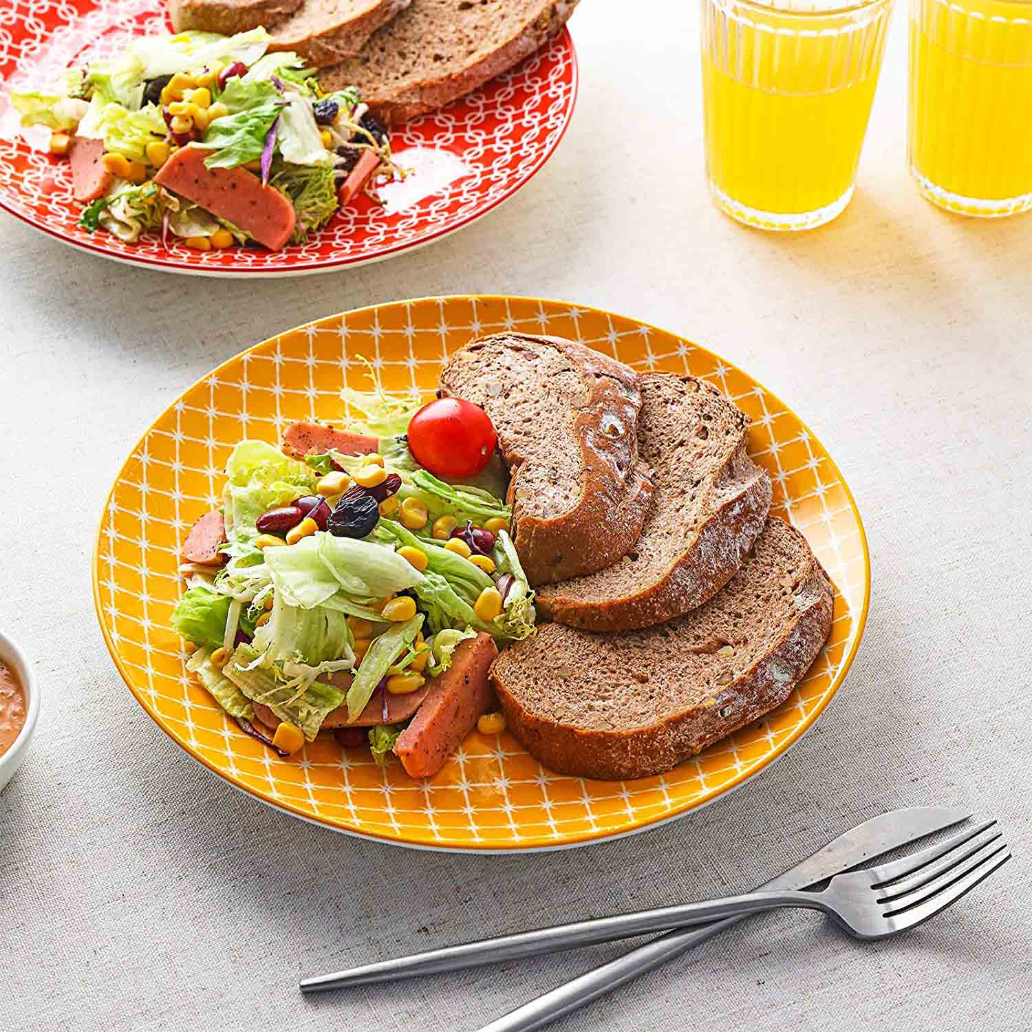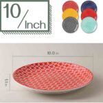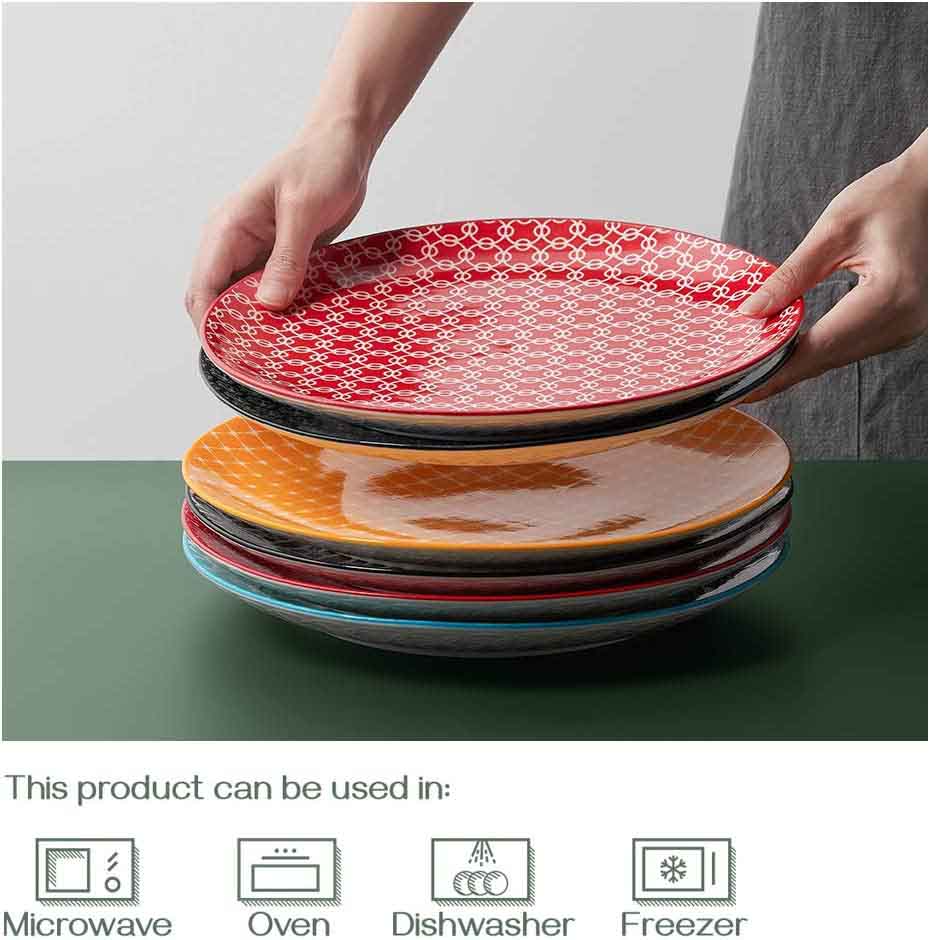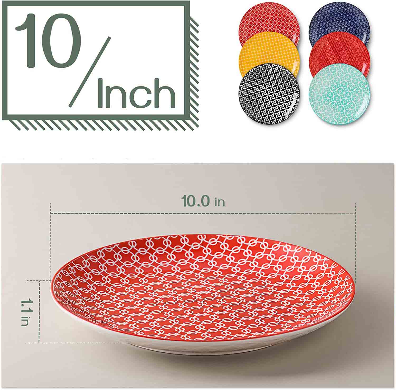 The ceramic dinner plate is about 10 inch, a standard size for meals like stir-fry, pasta, steak and more. They are large enough with a slightly flared rim to prevent food from spilling off the plate. Each plate is made of high quality ceramic materials, which keep it durable and long-life. These ceramic salad plates are fired at a high temperature to maximize the strength of the porcelain. Porcelain contain no lead or vadmium, chip resistant, they also won’t absorb odor or bacteria. Safe for daily use.