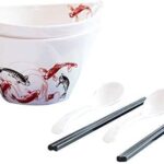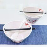 The item includes two 32-Oz ceramic ramen bowls, two oriental spoons and two set of chopsticks. Our ceramic ramen noodle soup bowls are made by high quality ceramic materials, which keep them durable and not easy to break. It is really a japanese style ceramic ramen bowl ! ! The porcelain ramen bowl comes with a utensil resting groove accross the top rim. Bowl measure is about 7 3/5’’ H x 5’’ W (At Widest Point) .