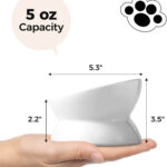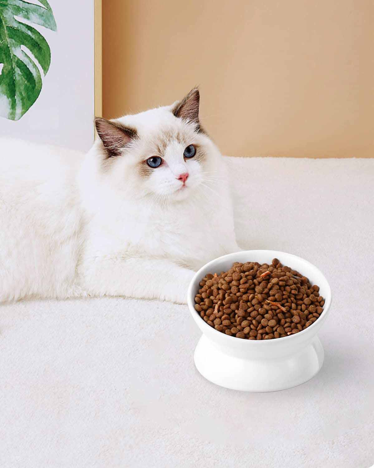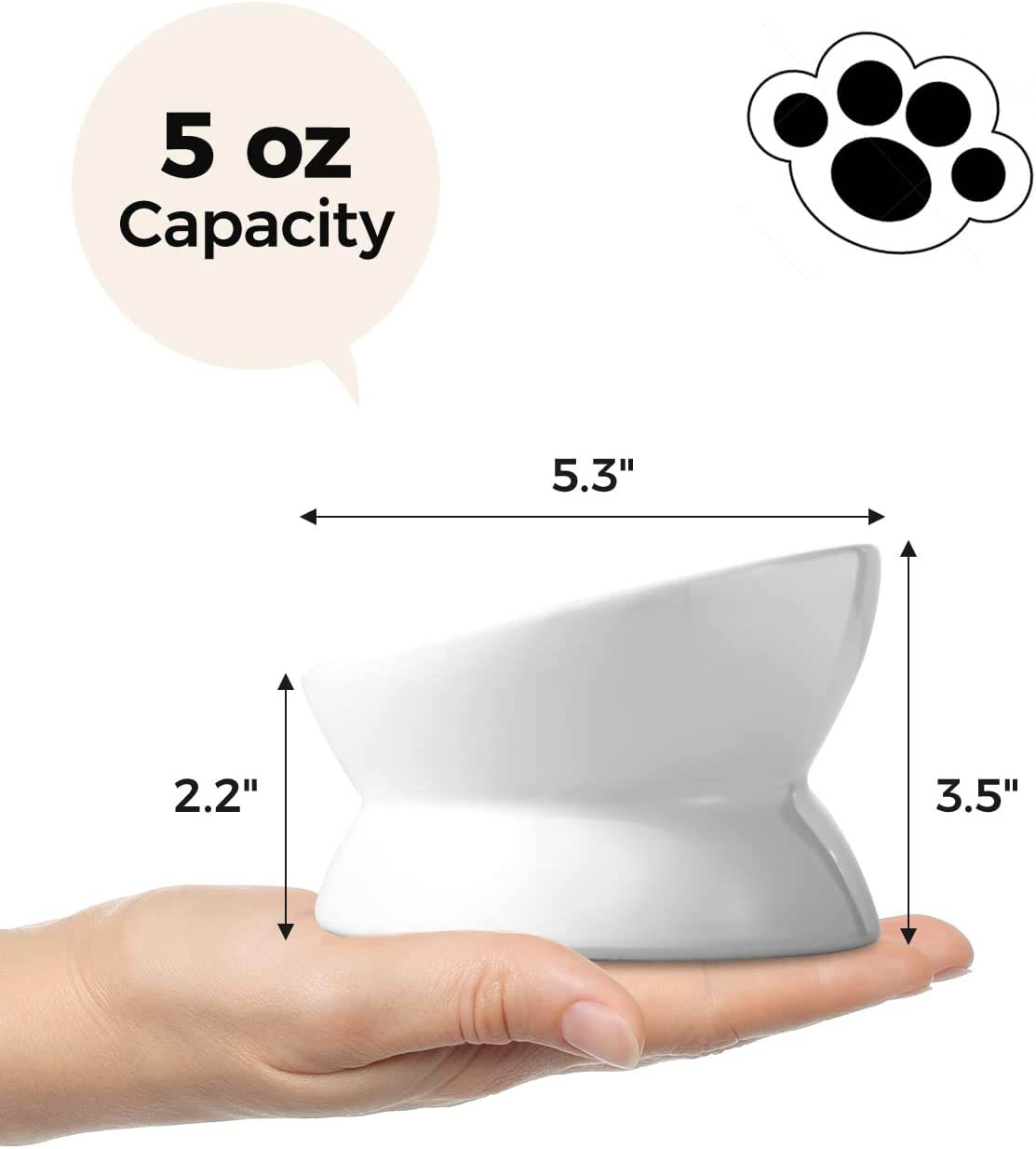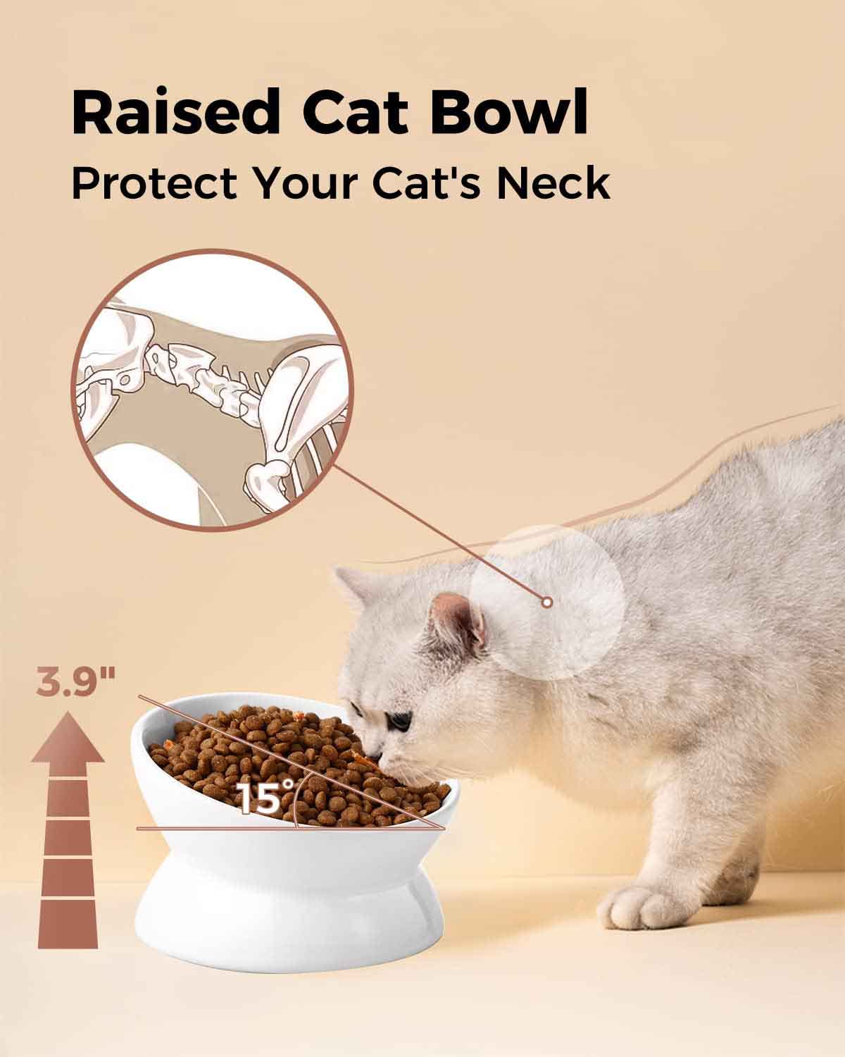 The elevated cat food bowl is suitable for older cats with arthritis or other mobility-limiting issues. Because the elevated cat food bowl can allow cats to eat or drink in a more correct position for comfort. And the ceramic pet bowl can help cat swallow more easily and alleviates their occasional vomiting. The raised and tilted pet bowl keeps food piled or falls to the center, which can keep the food from being pushed off the bowl, easy for your cat to eat. Perfect for flat face cats.